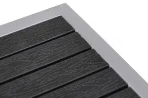 Material: Metallrahmen in metallischem Grau. Sitzfläche aus PVC-Latten in Holzoptik (schwarz – JP005).
